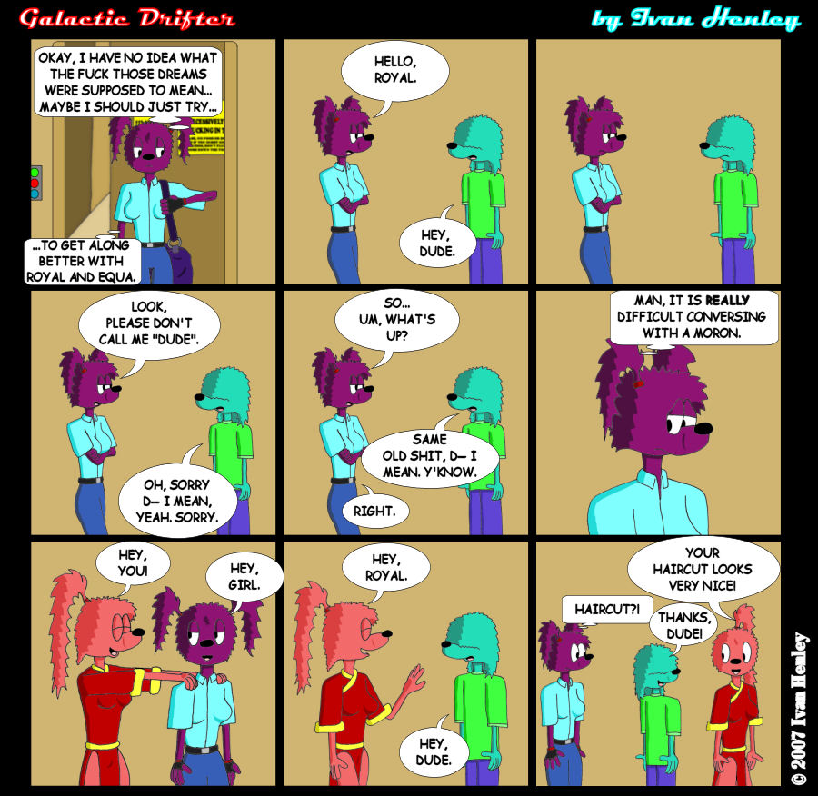 Ivan's Notes: Poor Sasha. I get a request every so often for Royal to get a haircut or something so that everyone can see his eyes. I think showing his eyes would kind of shatter a little bit of the charm of his character though, so I decided to turn the haircut business into a joke. Admire Royal's haircut, everyone! With his hair cut, he looks... well, no different. Yet somehow Fiona noticed. Back in five! |