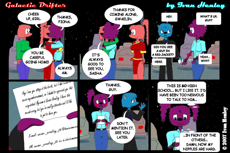 the chosen approach. The next move is hers. The parking lot for the Sparkledust Lounge is enclosed in an invisible force field, just in case you were wondering how the characters were breathing right here. Most of the businesses in the galaxy are set up in this manner. It's pretty much like how businesses are set up along the street, except in this case the "street" is outer space. You get the idea. Back in five! |