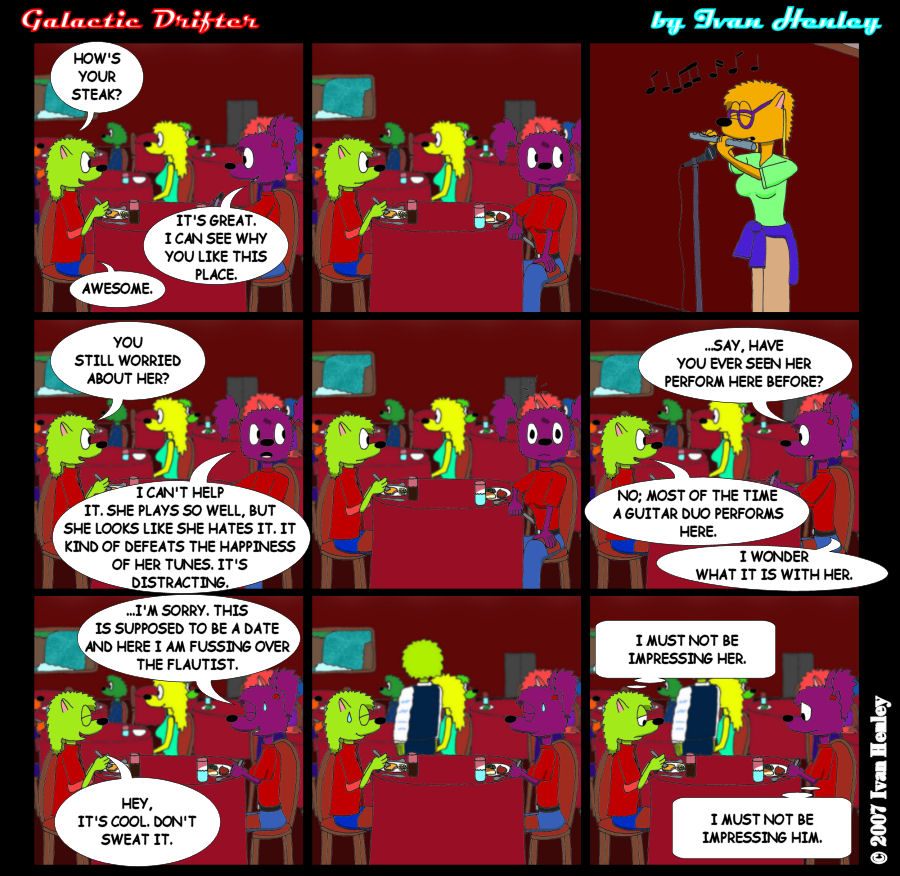 Ivan's Notes: Hmm. Awkward moment. The date would probably be going far more smoothly were it not for the flute player. Sasha and Xavier seem to get along well enough... at least right now. Still, this is only the first date, so who knows. One thing is certain: neither seems to feel that it's going as well as it could. Order your copy of the Galactic Drifter 2008 calendar today! Get it for yourself or someone special to you! More in five, and don't forget to visit the shop! |