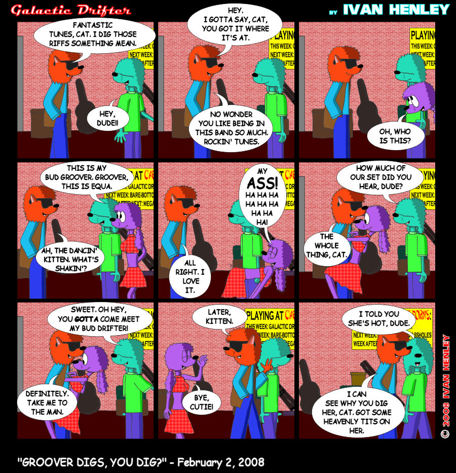Ivan's Notes: For those of you who were wondering what this Groover guy Royal instant messages so often looks like, now you know. I figured I'd kept him waiting in the wings long enough, and since Royal is keen on having him play with the band, it would make sense for Groover to listen to them first. And as big a gig as this was, Groover probably would have shown up anyway to see his friend play. Well, that's all I have this time. Get yourself something from the shop! See you next week! |