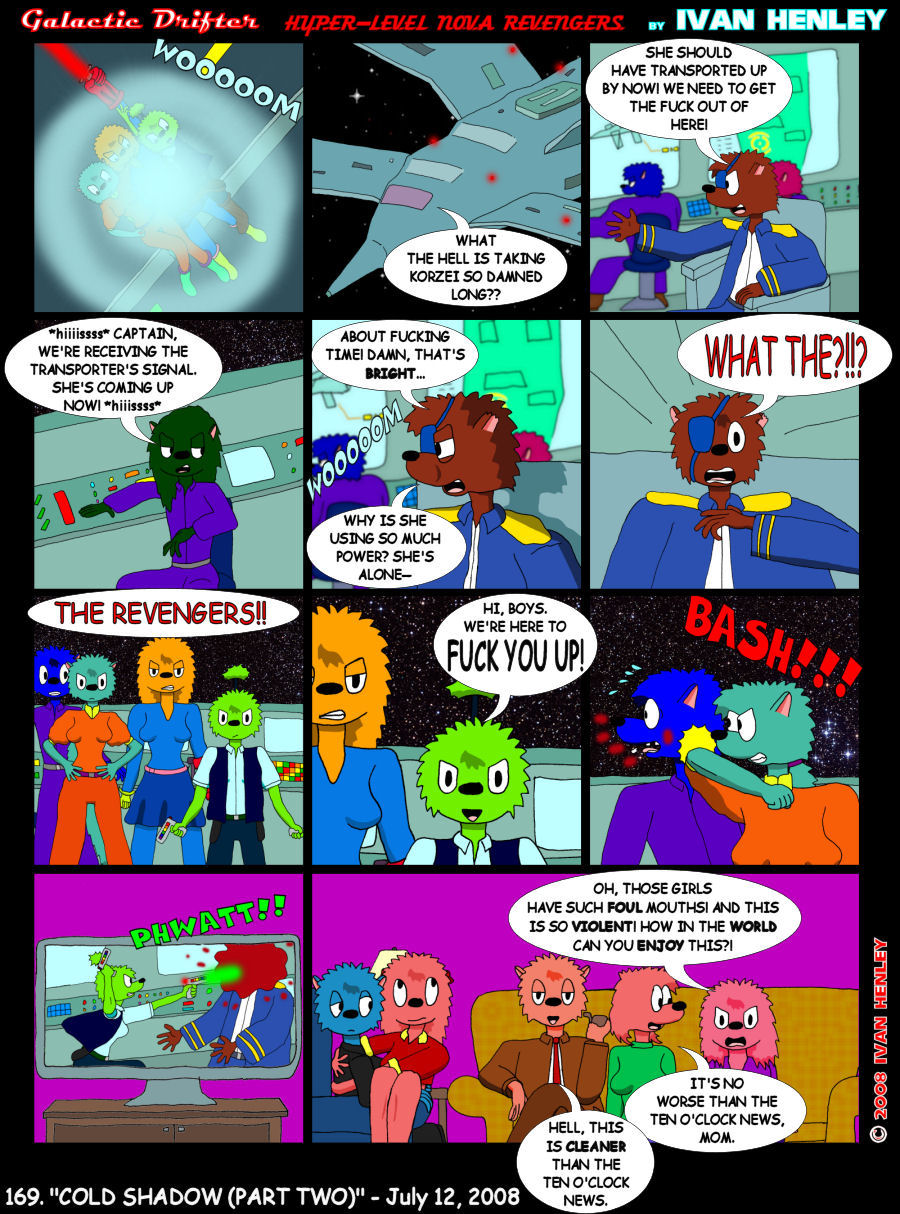 | Ivan's Notes: When I wrote the script for this installment, I honestly didn't plan on it being this big. It ended up kind of evolving into this monster during the drawing stage. I don't know why I keep on doing this to myself, but the final result does look good, doesn't it? I guess part of it is the fact that I really love the Revengers, and I don't get to do much with them on a regular basis (yet), so I couldn't really stop myself from giving them a much bigger appearance than last year. There's another reason for giving them such a big appearance: it's an additional "sneak peak", I guess you could call it, for the Revengers' very own comic. That's right: the Revengers will star in their own comic beginning Wednesday, August 6th! They will have their own spot on the website, just like Galactic Drifter does. The Revengers will start from the beginning and tell a full story over the weeks that follow. Mark your calendars and tune in! Well, that's all I have this time. Get yourself something from the shop! There are many nice gift items! See you next week! |