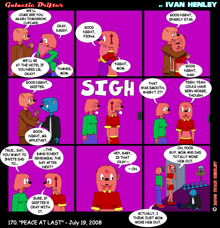 | Ivan's Notes: Now that we've got the visit with the Appletarts told, it's time to move ahead. A new plotline is right around the corner, and it will take the story in quite a different direction. She hasn't been seen since January, and I think that's more than long enough; it's time to bring Equa back in. In the next installment we'll get a peek at where she lives as well as one of her roommates. We won't be getting into the new story arc instantly; it will develop over the next few weeks. Equa is heavily involved in it, however, which will be the first time since her debut that she gets the spotlight. The story will touch upon a few details about her that were revealed in Galactic Drifter - Love and Divorce and help us get to know her a little better. Well, that's all I have this time. Get yourself something from the shop! These things make great gifts! See you next week! |