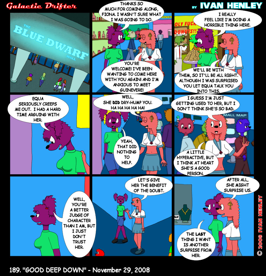 | Ivan's Notes: I must be some kind of masochist. It may not look like it, but quite a lot of work went into this one, and some of the details wound up getting covered up by the speech balloons. The installments that follow this one are similarly going to require a lot of work. I just had to go and set this in a mall. Oy. But I admit that I did want to feature the Blue Dwarf Mall; it had been mentioned before but never shown, and I figure a mall is a pretty popular place for meet-ups and whatnot. But it's a pain to draw. Well, that's all I have this time. The holidays are near, so get something from the shop for yourself or for someone else! Remember, my shop has great stuff! See you next week! |
