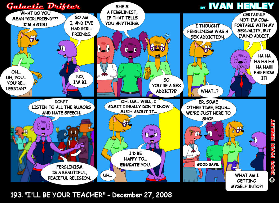 | Ivan's Notes: WOOO!!! Made it through another year! I'm getting good at this! Obviously Guinevere feels a little overwhelmed, perhaps even fearing she may be in over her head, but she still hasn't fled yet, so that's got to say something! Who knows if Equa has any kind of a shot with her at all, though it certainly doesn't appear likely. We'll just have to wait and see! This is the final installment for 2008. 2008 wasn't quite the amazing year 2007 was; it had more downs than ups. Still, it wasn't a bad year overall, just not a great one. Here's hoping for a really GOOD year in 2009. The story will continue then, and we'll hopefully get a better idea of what Guinevere really thinks of all this, and what it may mean for Equa! Well, that's all I have this time. See you in 2009! |