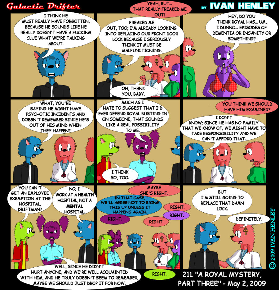 Ivan's Notes: Another dialogue-heavy installment. Something must be wrong with me. I considered making this one twelve panels, but even making it nine panels took me longer than I expected it to, and since I managed to find a way to get everyone's dialogue in, I stuck with nine. We're going to move on from this to something else, with next week's comic being the transition. Well, what we're moving onto isn't a completely different situation, since we're staying in the studio, but the focus will no longer be Royal's strange appearance in Drifter's bed. Perhaps some other time we may get an explanation for that. Or perhaps it will be one of life's great unsolved mysteries. Who knows. Well, that's all I have this time, so see you next week, and don't forget to check out the shop! |